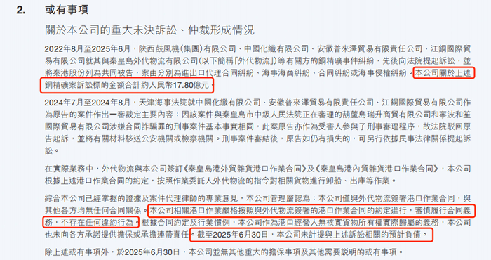 公司强调,秦港股份仅与秦皇岛外代物流有限公司签订有港口作业合同,与案件其他各方并无合同关系。公司严格执行合同约定开展港口作业,不存在违约行为。