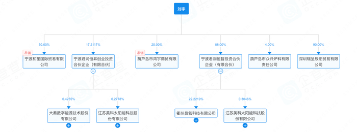 企查查数据显示,刘宇目前是深圳瑞呈辰阳贸易等2家公司的法定代表人,另在宁波亿铜源国际贸易等6家公司担任股东,其持有宁波君润恒智投资和宁波君润恒昇创业投资两家私募88%及17.2%的股权。