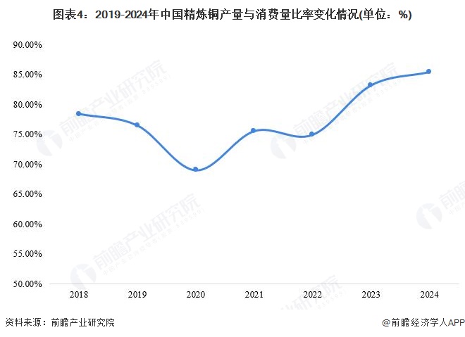 2016-2024年,中国精炼铜产量与消费量的比率整体呈现波动上行趋势,表明国内产量提高,不断满足国内需求。2024年,中国精炼铜产量与消费量的比率为84.97%,相比2023年进一步上涨。虽然国内产量不断提高,但是仍无法满足快速增长的需求,所以需要进口更多的产品,从而导致贸易逆差进一步扩大。