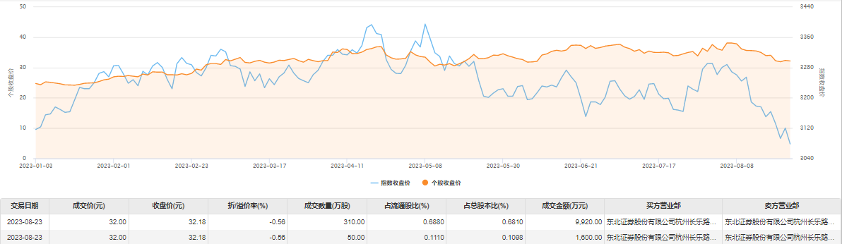 8月23日大宗交易成交360万股,成交额1.15亿元,占当日总成交额的39.7%,成交价32元,较市场收盘价32.18元折价0.56%。
