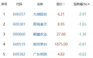 大湖股份、青海春天、顺鑫农业、贵州茅台、广东明珠位列涨幅榜后五位,涨幅分别为-2.97%、-1.65%、-1.36%、-0.81%、-0.62%。