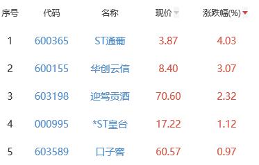 其中,ST通葡、华创云信、迎驾贡酒、*ST皇台、口子窖位列板块涨幅前五位,涨幅分别为4.03%、3.07%、2.32%、1.12%、0.97%。