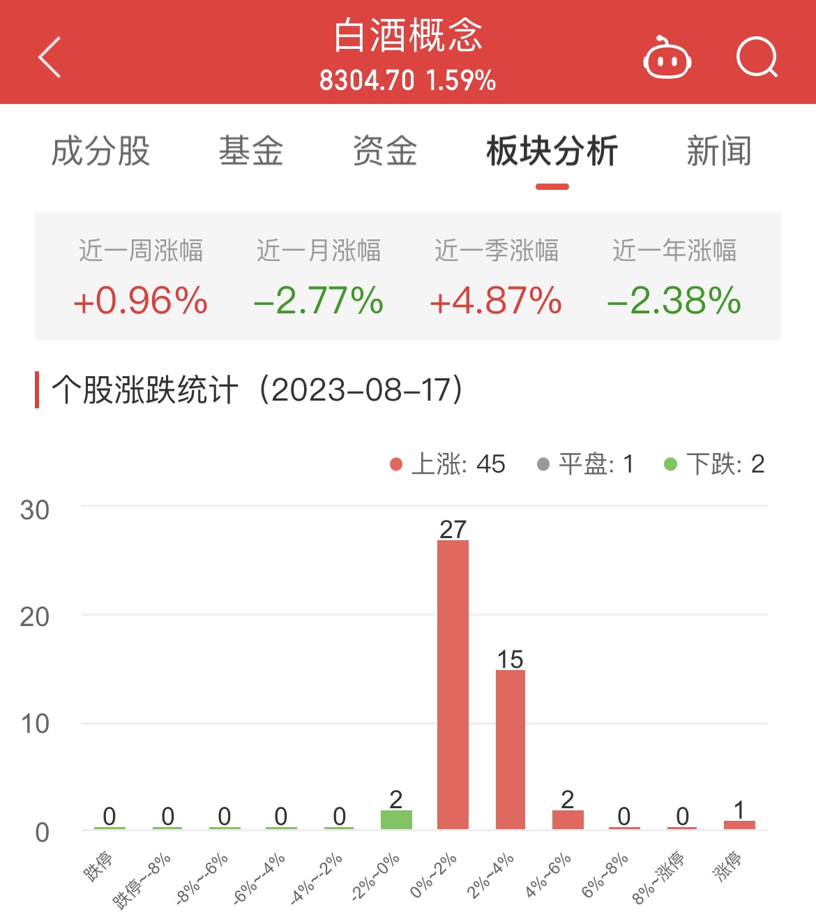 中国经济网北京8月17日讯今日,白酒概念板块整体涨幅1.59%,其中45只股票上涨,1只股票平盘,2只股票下跌。