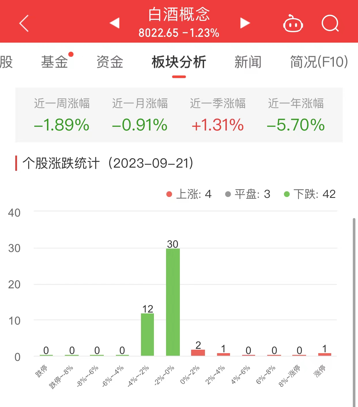 中国经济网北京9月21日讯今日,白酒概念板块整体跌幅1.23%,其中4只股票上涨,3只股票平盘,42只股票下跌。
