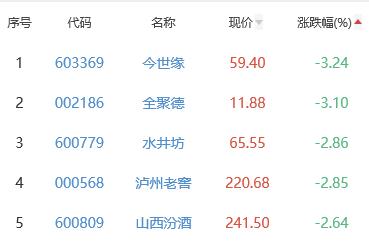 今世缘、全聚德、水井坊、泸州老窖、山西汾酒位列涨幅榜后五位,涨幅分别为-3.24%、-3.10%、-2.86%、-2.85%、-2.64%。