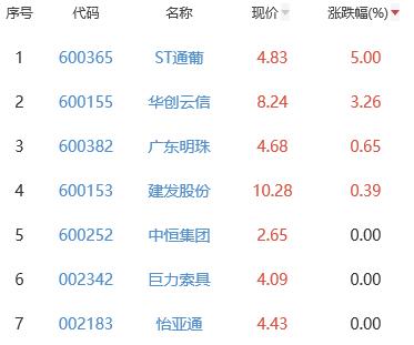 其中,ST通葡、华创云信、广东明珠、建发股份、中恒集团、巨力索具、怡亚通位列板块涨幅前五位,涨幅分别为5.00%、3.26%、0.65%、0.39%、0.00%、0.00%、0.00%。