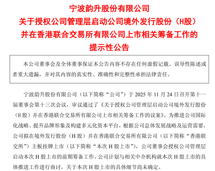 瑞财经 王敏11月24日,宁波韵升股份有限公司(以下简称“宁波韵升”)发布公告,为推进公司国际化战略、提升品牌形象及构建多元化资本平台,根据公司总体发展战略及运营需要,公司拟在境外发行股份(H股)并在港交所主板挂牌上市,公司董事会授权公司管理层启动本次H股上市的前期筹备工作。