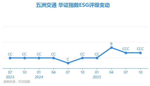 日前,华证指数公布了新一期(2025年10月31日)的ESG评级结果,五洲交通(600368.SH)获得CCC评级(华证指数评级为C起至AAA九档,C为最低档,AAA为其最高一级评级/AA为其第二档),上一期(2025年7月31日)ESG评级为CCC。本期ESG评级在45家交通基本设施行业A股上市公司中排名第30(上一期排名第29)。