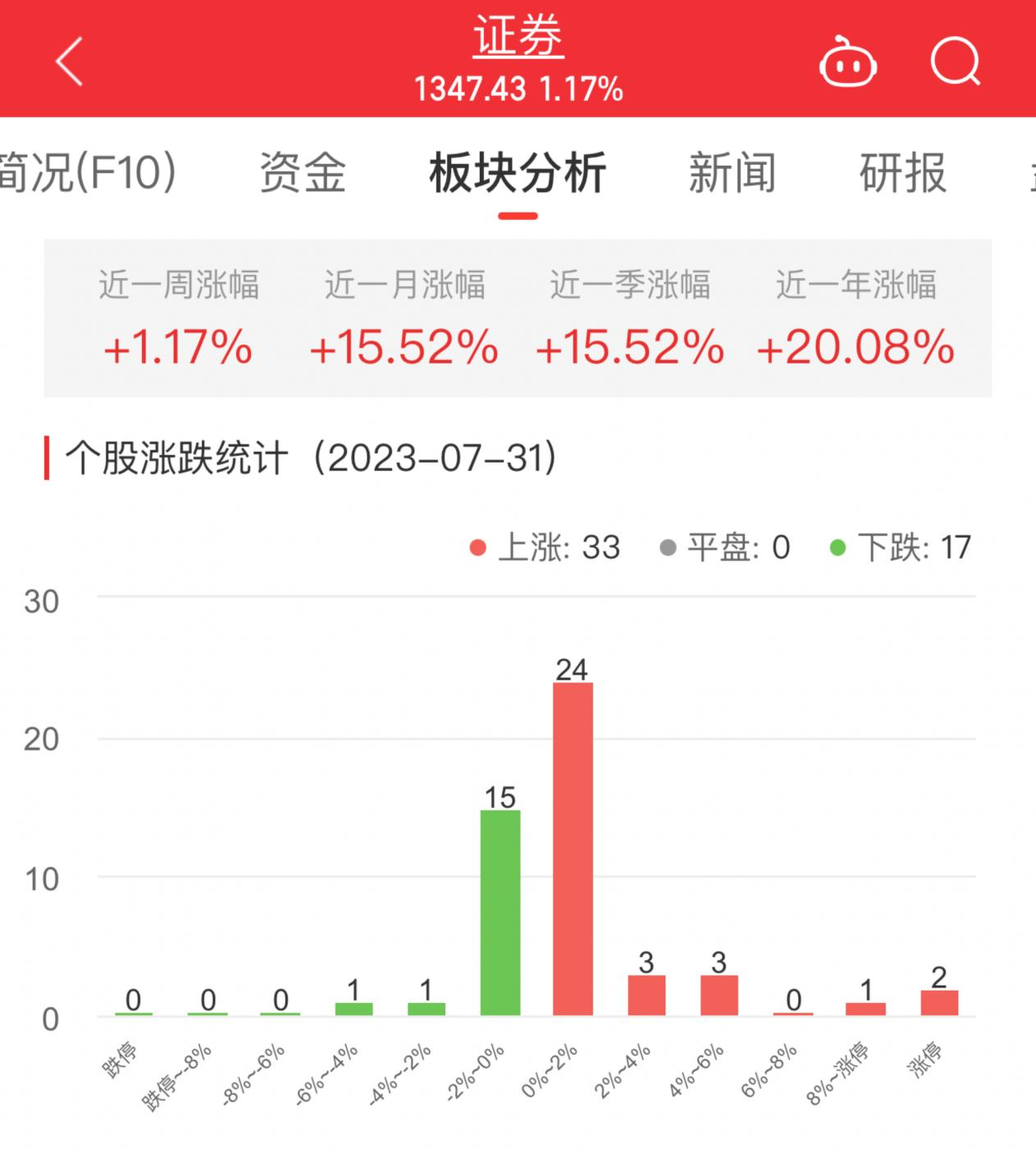 中国经济网北京7月31日讯 今日,证券板块整体涨幅1.17%,其中33只股票上涨,17只股票下跌。