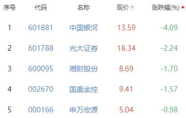 中国银河、光大证券、湘财股份、国盛金控、申万宏源位列涨幅榜后五位,涨幅分别为-4.09%、-2.24%、-1.70%、-1.57%、-0.98%。