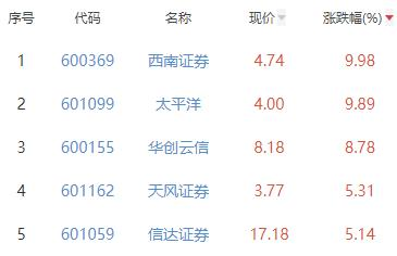 其中,西南证券、太平洋、华创云信、天风证券、信达证券位列板块涨幅前五位,涨幅分别为9.98%、9.89%、8.78%、5.31%、5.14%。