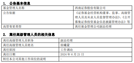 股份有限公司发布基金行业高级管理人员变更公告,副总经理侯曦蒙因工作调动于2024年6月21日离任。
