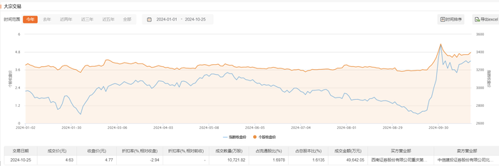 今日大宗交易成交1.07亿股,成交额4.96亿元,占当日总成交额的47.96%,成交价4.63元,较市场收盘价折价2.94%。