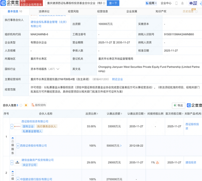 企查查APP显示,近日,重庆建源西证私募股权投资基金合伙企业(有限合伙)成立,出资额10亿元,经营范围包含以私募基金从事股权投资。企查查股权穿透显示,该企业由西南证券(600369)全资子公司西证股权投资有限公司、建设银行(601939)全资子公司建信金融资产投资有限公司等共同出资。