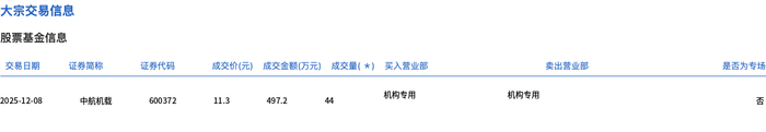 12月8日,中航机载大宗交易成交44万股,成交额497.2万元,占当日总成交额的0.59%,成交价11.3元,较市场收盘价12.63元折价10.53%。