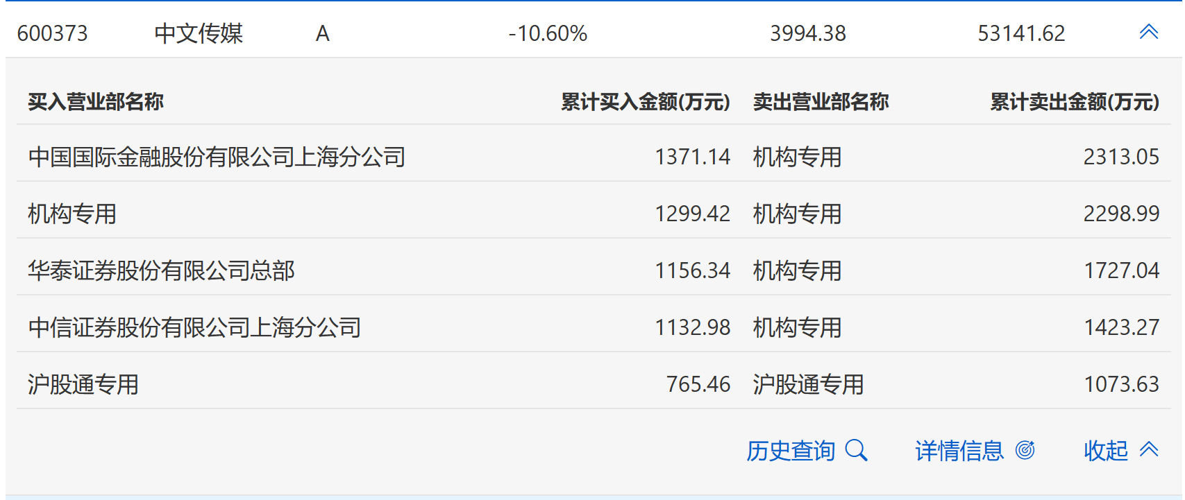 12月21日,中文传媒今日跌停,全天换手率达2.95%,振幅达7.57%。龙虎榜数据显示,营业部席位合计净卖出3110.65万元。其中,机构买入1299.42万元,卖出7762.35万元,合计净卖出6462.94万元。此外,沪股通专用分别卖出1073.63万元;中国国际金融上海分公司、华泰证券总部分别买入1371.14万元、1156.34万元。
