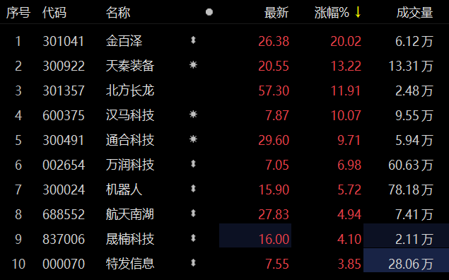 上证报中国证券网讯 5月25日,军工股异动拉升,截至9时51分,金百泽20%涨停,汉马科技涨停。天秦装备、北方长龙涨超10%。