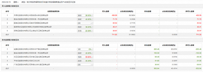 具体来看,开源证券西安西大街证券营业部、国金证券深圳湾一号证券营业部分别买入499.99万元、71.79万元;诚通证券郑州丰产路证券营业部、国金证券深圳湾一号证券营业部分别卖出285.48万元、135.50万元。
