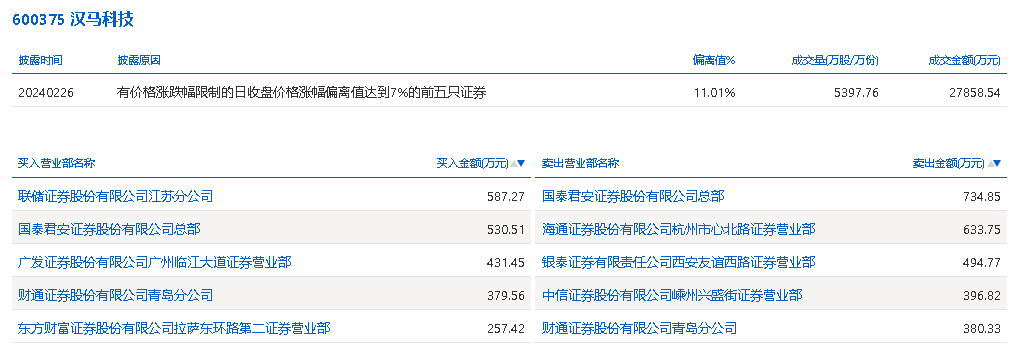 2月26日,汉马科技今日涨停,龙虎榜数据显示,上榜营业部席位全天成交4826.74万元,占当日总成交金额比例为17.33%。其中,买入金额为2186.21万元,卖出金额为2640.52万元,合计净卖出454.31万元。