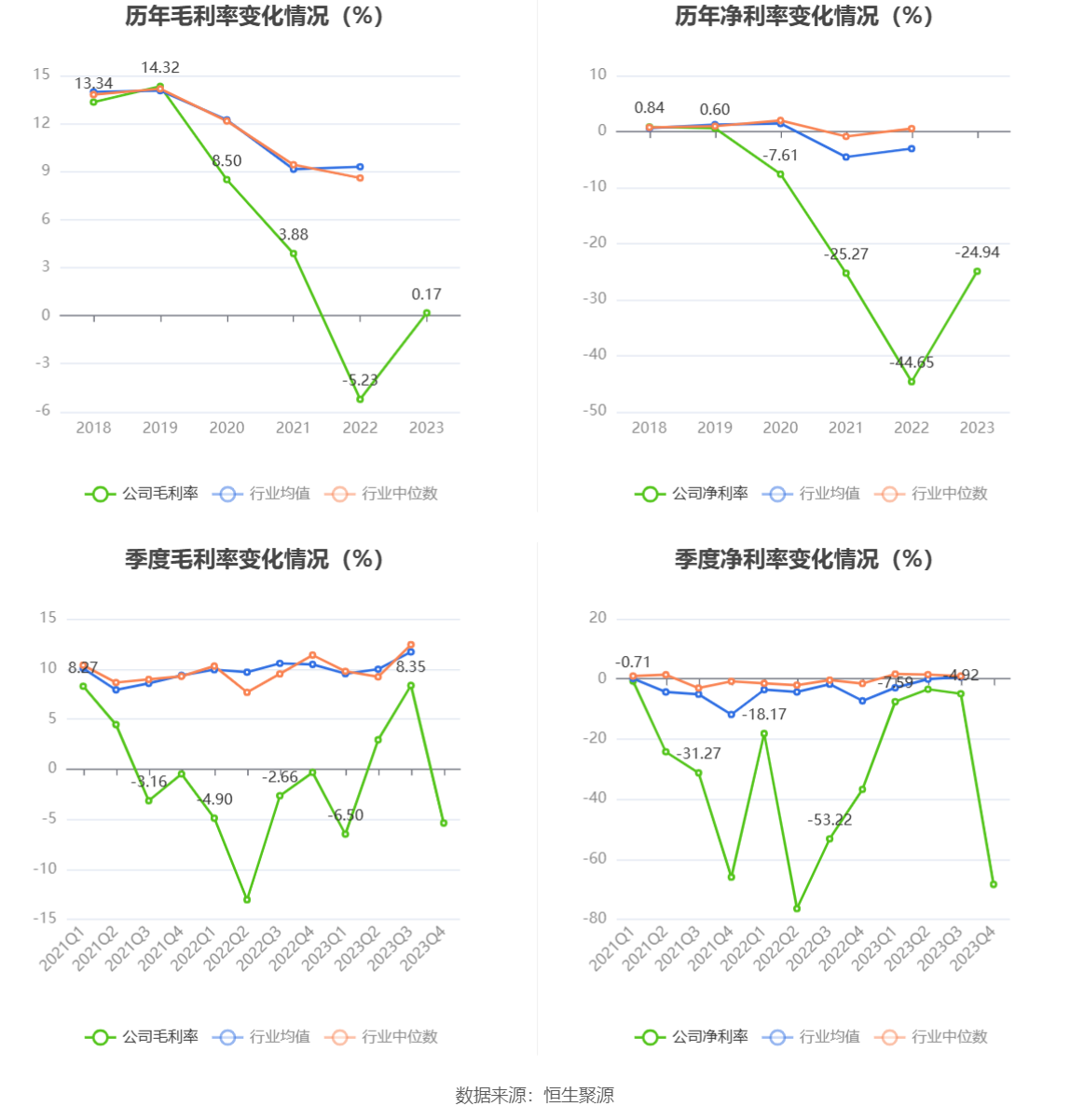 2023年,公司毛利率为0.17%,同比上升5.40个百分点;净利率为-24.94%,较上年同期上升19.71个百分点。从单季度指标来看,2023年第四季度公司毛利率为-5.39%,同比下降5.06个百分点,环比下降13.74个百分点;净利率为-68.38%,较上年同期下降31.63个百分点,较上一季度下降63.46个百分点。