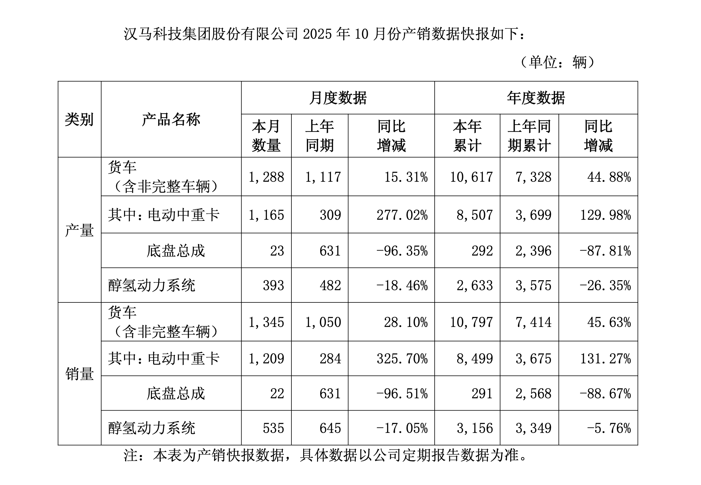 上证报中国证券网讯(记者 刘一枫)11月3日,汉马科技发布2025年10月份产销快报公告。汉马科技新能源中重卡10月份产销同比分别增长277.02%和325.7%、今年1至10月累计产销同比分别增长129.98%和131.27%,领跑新能源重卡市场。记者获悉,汉马科技10月营收预计突破6亿元,创近5年来单月最佳成绩。