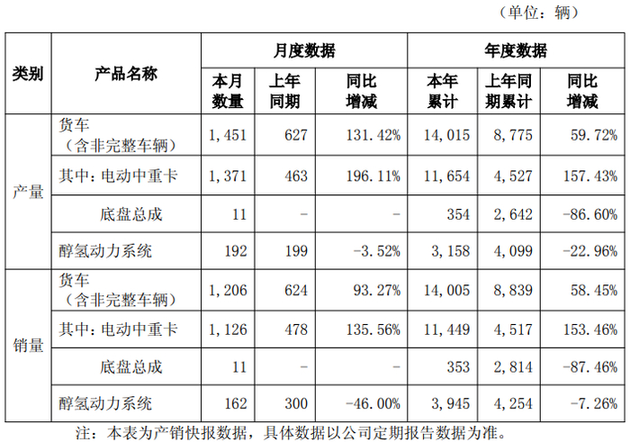 在销量方面,货车(含非完整车辆)销量为1206辆,同比增长93.27%;年度累计销量为1.4万辆,同比增长58.45%。具体数据如下: