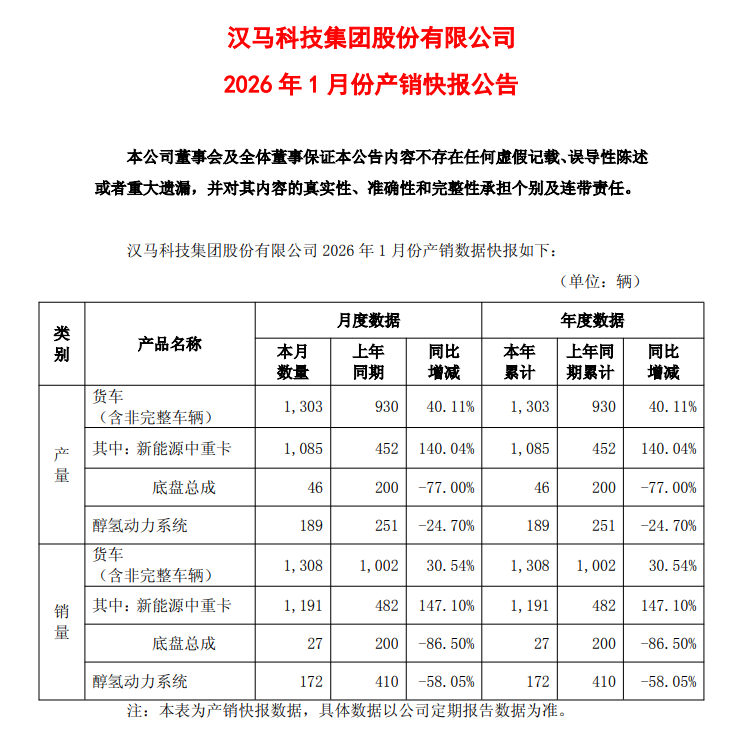 2月3日,汉马科技(600375.SH)发布了2026年1月份产销快报公告。