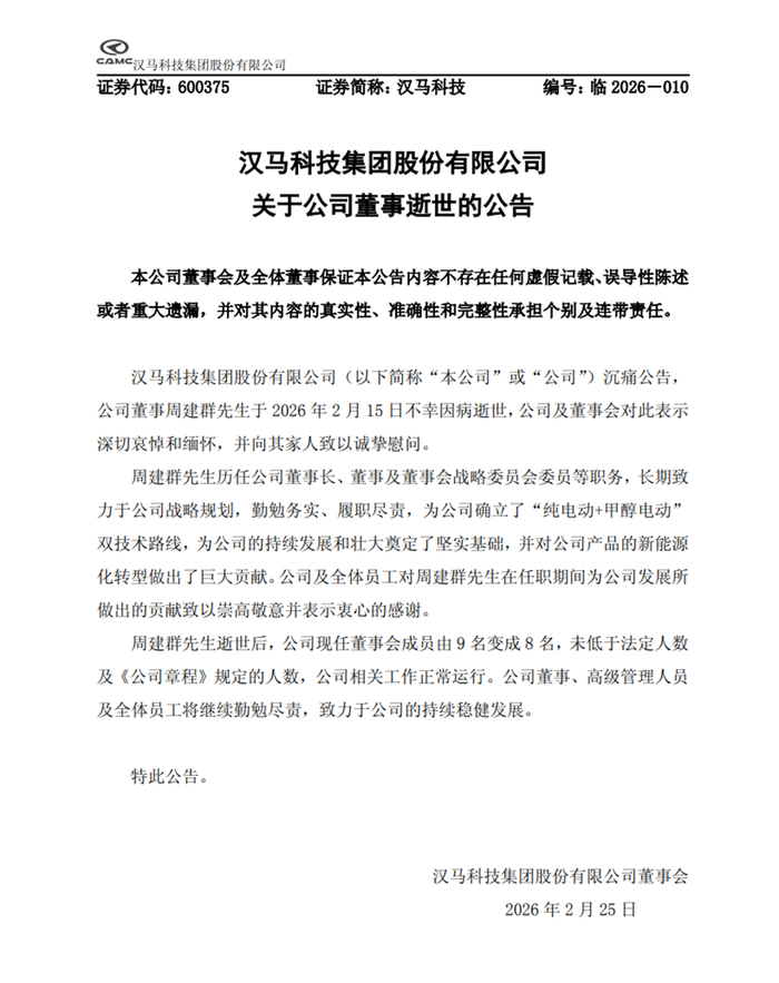 2月24日,汉马科技发布公告称,公司董事周建群于2026年2月15日不幸因病逝世。