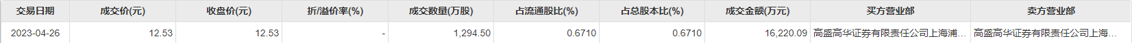 4月26日大宗交易成交1294.5万股,成交额1.62亿元,占当日总成交额的46.82%,成交价12.53元,较市场收盘价12.53元持平。
