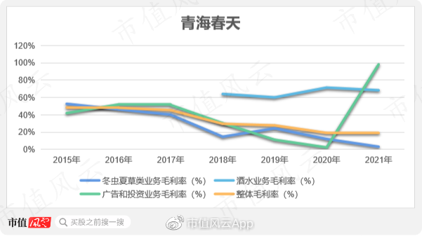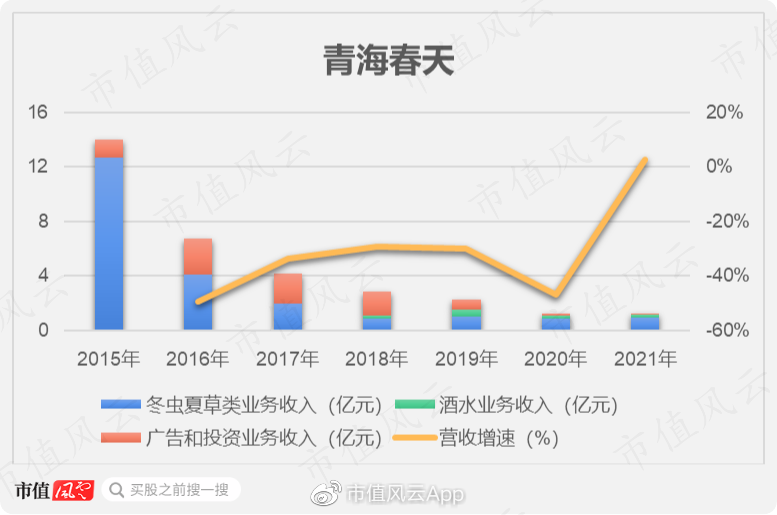 2016年,冬虫夏草梦破灭后,青海春天的业绩表现就开始一落千丈。而后陆续开拓广告、投资等业务,均表现不佳。