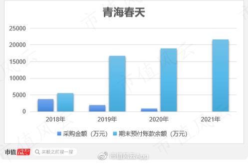 与之对应的,是连续飙涨的预付款项。以2019年为例,青海春天向其采购酒水1,914万元,却新增了1.11亿预付账款。