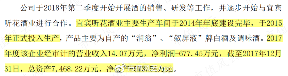 合作之前,宜宾听花酒业是个投产不到3年的小酒厂,资不抵债,2017年营收14万,亏损677万。