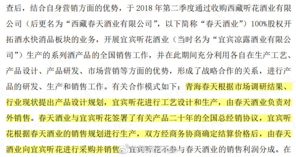 前面提过,听花酒实为宜宾听花酒业生产,青海春天向其采购后再进行销售。