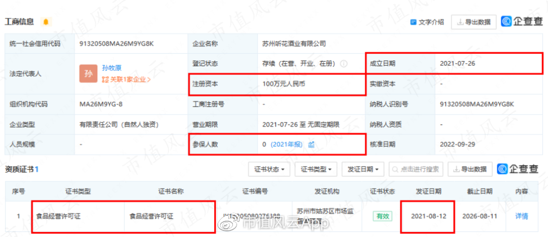 还有金华市读花酒业有限公司,2022年3月成立,注册资本10万块,0员工,压根没拿到食品经营许可证,就成为酒水业务经销商。