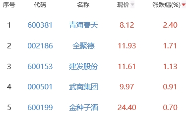 其中,青海春天、全聚德、建发股份、武商集团、金种子酒位列板块涨幅前五位,涨幅分别为2.40%、1.71%、1.13%、0.91%、0.70%。