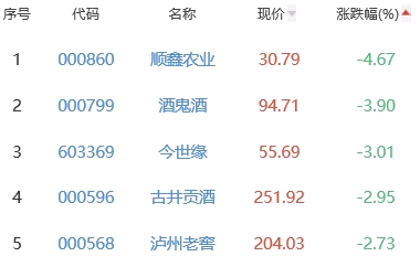 顺鑫农业、酒鬼酒、今世缘、古井贡酒、泸州老窖位列涨幅榜后五位,涨幅分别为-4.67%、-3.90%、-3.01%、-2.95%、-2.73%。