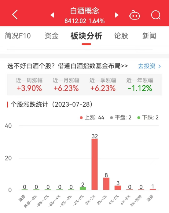 中国经济网北京7月28日讯今日,白酒概念板块整体涨幅1.64%,其中44只股票上涨,2只股票平盘,2只股票下跌。