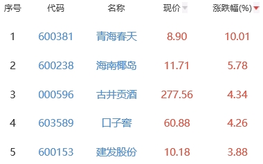 其中,青海春天、海南椰岛、古井贡酒、口子窖、建发股份位列板块涨幅前五位,涨幅分别为10.01%、5.78%、4.34%、4.26%、3.88%。