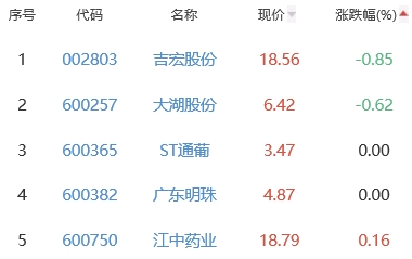 吉宏股份、大湖股份、ST通葡、广东明珠、江中药业位列涨幅榜后五位,涨幅分别为-0.85%、-0.62%、0.00%、0.00%、0.16%。