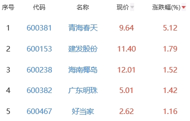 其中,青海春天、建发股份、海南椰岛、广东明珠、好当家位列板块涨幅前五位,涨幅分别为5.12%、1.79%、1.52%、1.42%、1.16%。