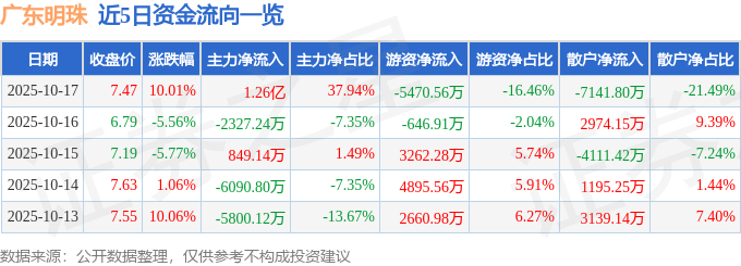 证券之星消息,广东明珠10月17日涨停收盘,收盘价7.47元。该股于9点42分涨停,未打开涨停,截止收盘封单资金为9290.78万元,占其流通市值1.79%。