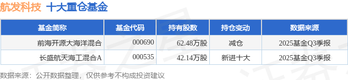 持有航发科技最多的基金为前海开源大海洋混合,目前规模为2.12亿元,最新净值1.639(10月29日),较上一交易日上涨0.43%,近一年上涨1.86%。该基金现任基金经理为刘宏。