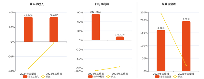 公司营业总收入为30.68亿元,在已披露的同业公司中排名第27,较去年同报告期营业总收入减少5360.67万元,同比较去年同期下降1.72%。归母净利润为332.42万元,在已披露的同业公司中排名第47,较去年同报告期归母净利润减少2089.47万元,同比较去年同期下降86.27%。经营活动现金净流入为5.87亿元,在已披露的同业公司中排名第33,较去年同报告期经营活动现金净流入增加1.05亿元,实现2年连续上涨,同比较去年同期上涨21.72%。