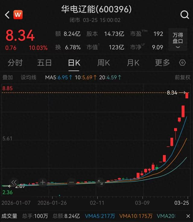 其中,华电辽能今早开盘2分钟再度直线拉升涨停,一举刷新此前由年内电力板块领涨标杆豫能控股创下的7连板纪录,进而带动市场短线情绪进一步回暖。截至收盘,华电辽能报8.34元/股,总市值122.82亿元。自3月16日以来,华电辽能累计涨幅近115%。