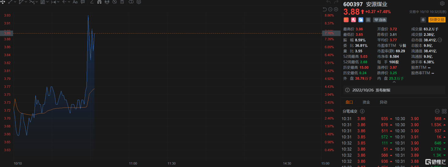 格隆汇10月10日丨煤炭板块进一步走强,安源煤业冲击涨停,晋控煤业、中煤能源、山煤国际、山西焦煤、华阳股份等涨幅居前。
