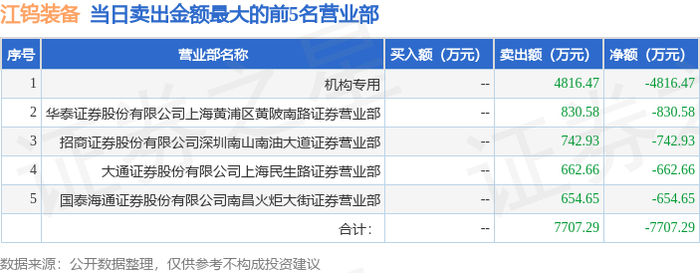 9月29日江钨装备(600397)龙虎榜数据:机构净卖出4816.47万元