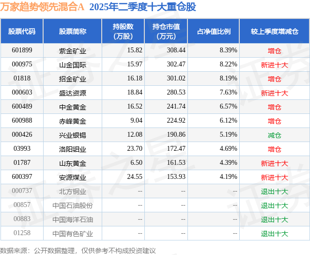 根据2025基金半年报公募基金重仓股数据,重仓该股的公募基金共5家,其中持有数量最多的公募基金为万家基金的万家趋势领先混合A。万家趋势领先混合A目前规模为0.18亿元,最新净值1.891(10月13日),较上一交易日上涨2.41%,近一年上涨73.07%。该公募基金现任基金经理为叶勇。叶勇在任的基金产品包括:万家双引擎灵活配置混合A,管理时间为2018年8月24日至今,期间收益率为167.86%;万家北交所慧选两年定开混合A,管理时间为2021年11月23日至今,期间收益率为88.96%;万家周期驱动股票发起式A,管理时间为2023年10月31日至今,期间收益率为62.85%;