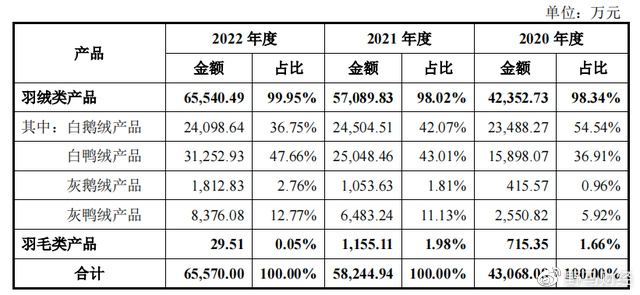 古麒绒材便是在21世纪初进入行业,成立于2001年。不过古麒绒材并不直接做羽绒服,而是聚焦于高规格羽绒产品的研发、生产和销售。按品种和颜色,又可细分为白鹅绒产品、灰鹅绒产品、白鸭绒产品、灰鸭绒产品。古麒绒材的营收主要来自于白鹅绒和白鸭绒产品,营收占比超过80%。