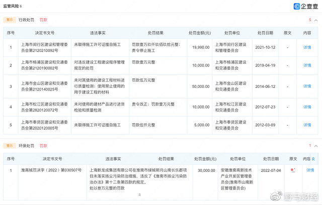 据企查查显示,古麒绒材选择较高报价的上海新龙成,6次因未取得施工许可证擅自施工、未对使用的建材产品进行质量检测、环境污染等问题被处罚。罚金最高五万元,最新一次为2022年7月,因未落实扬尘污染防治措施被处罚3万元。
