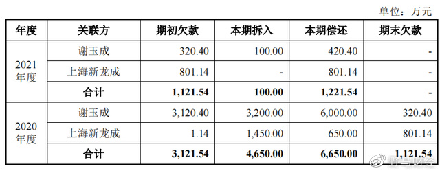 谢伟的妹妹谢灿,则另有生意,拥有两家建筑类公司、一家典当公司和投资公司。2019-2021年,古麒绒材合计向谢灿实控的上海新龙成和谢玉成借款1121万元和3121万元,但还款金额达到了1221万元和6650万元。